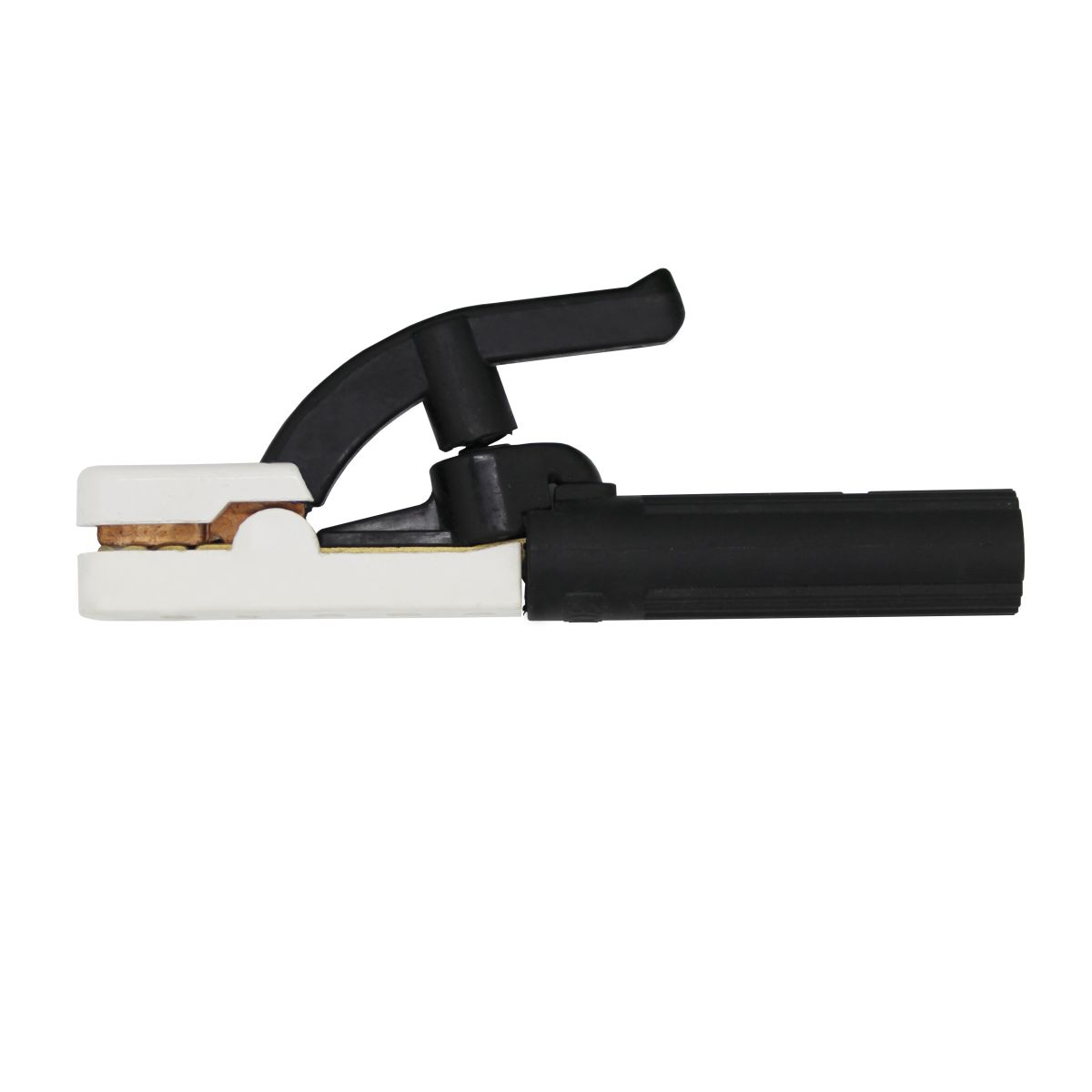 Нижняя латунная губка и верхняя стальная значительно продлевают срок эксплуатации электрододер-жателя, в отличии от моделей с полностью стальными губками. | В конструкции использована усиленная пружина для лучшей фиксации сварочного электрода. | Длинное латунное основание позволяет работать на больших токах с повышенным коэффициен-том полезной нагрузки. |