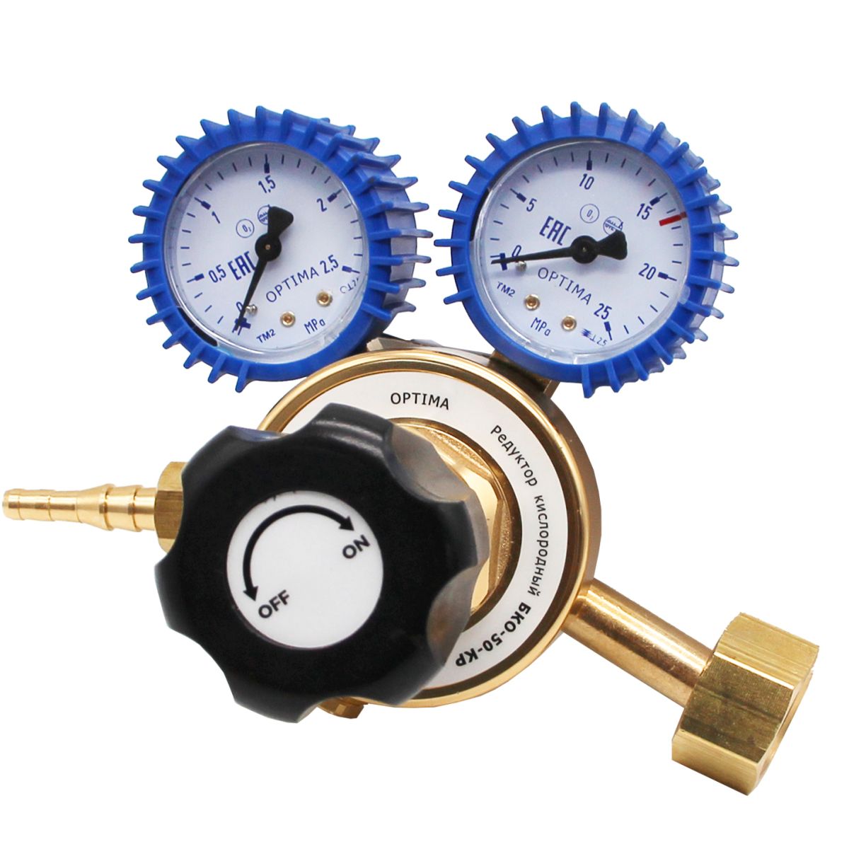 Редуктор кислородный БКО-50-КР (Optima) крупногабаритный предназначен для понижения давления газа, поступающего из баллона, и автоматического поддержания постоянным заданного рабочего давления при газопламенной обработке.