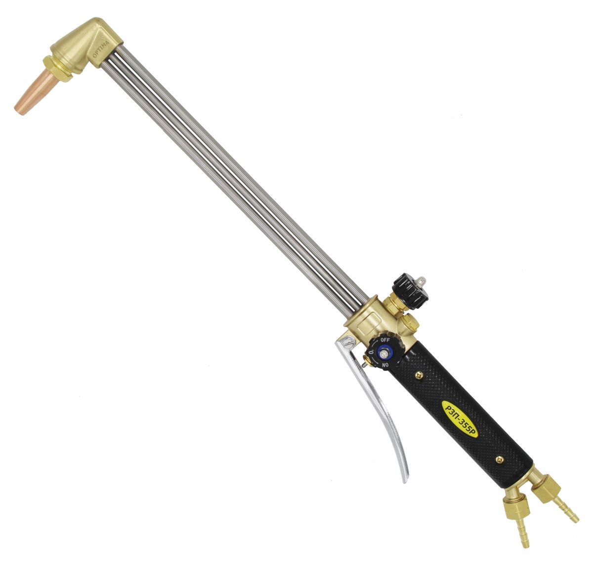 Резак трёхтрубный универсальный Р3-355Р (Optima) с усиленным клапаном и внутрисопловым смешением газов предназначен для ручной газокислородной резки листового и сортового металла из низкоуглеродистых сталей с использованием кислорода по ГОСТ 5583 и пропана технического марки ПТ, бутана технического марки БТ, смеси пропан-бутановой марки СПБТ по ГОСТ 20448.